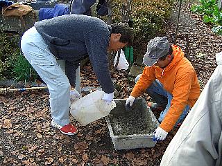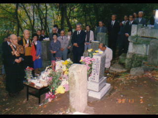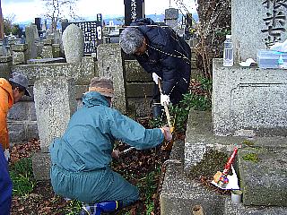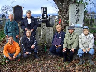| 墓修理 墓がだいぶ傾いたので、桜の根を切り、土台を据え直して真っすぐに直した。会津歴史研究会、喜多方史談会のメンバーも駆け付けて協力してくれた。2007平成19年11月6日 Grave Repair Since the grave had tilted considerably, the roots of the cherry tree were cut and the foundation was set back in place to straighten it out. Members of the Aizu Historical Society and the Kitakata Historical Society also came to help. |