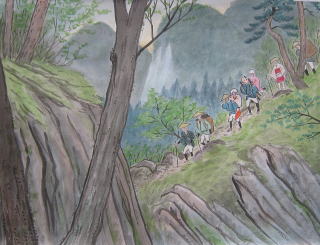 中沢兼五郎、塚越房吉は三左衛門に村へ戻って金を工面してくるよう命じられ、中条村から権田へ戻る。途中、白根山の中腹芳ケ平で警戒中の松代藩兵につかまり、牢屋へ入れられて取調べを受けたのち、許されてほうほうの態で権田へ着いた。 Two villagers who returned to Gonda Village for money Kengoro Nakazawa and Fusakichi Tsukagoshi were ordered by Sanzaemon Nakajima to return to Gonda Village to get money. On their way to Gonda, they were caught by the Matsushiro Clan soldiers on guard at Yoshigadaira, halfway up Mt. Kusatsu-Shirane, and taken to jail for questioning. However, they were somehow forgiven and arrived in Gonda. In the village, however, they could not get the money they wanted after Kozukenosuke had already been killed, and with little money they managed to collect, they headed back to Aizu. Since they had been detained in Matsushiro for several days, they thought they would not be able to catch up with the others by going around Echigo, so they followed the "Aizu Kaido" route from Gonda to Numata, Katashina, Oze, Hinemata, and Aizu, arriving at Aizu-Wakamatsu where they were met by the party. |