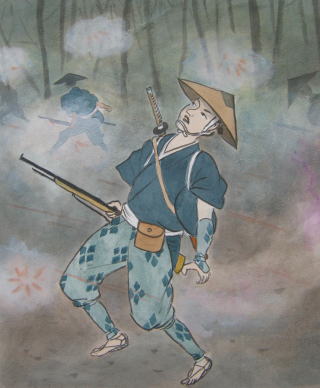 | 上州権田村(字水有)出身。小栗歩兵の一人で築地講武所でフランス式陸軍の訓練を受ける。小栗上野介が権田村へ移って三日目に暴徒に襲われたとき、機敏な活躍をして中小姓格に取り立てられる。夫人護衛の途中から会津軍朱雀士四番中隊町野源之助(主水)の付属誠志隊に加わって三国峠戦争や小出島の戦いに参加。九月十一日喜多方市熊倉の戦いで戦死、21歳。熊倉の杉の下墓地(熊倉小学校の北の農道沿い)に墓がある。 ◆会津戦争のうち、西軍に勝利した九月十一日の「熊倉戦争」 については、『復古記』第十四冊 p175 に詳しく記載されている。 ![]() 画:清水市衛 Ginjuro Sato, age 21, killed in the Kumakura War Born in Gonda Village (Mizuari Area), Jyoshu Province (today's Gunma Prefecture). He was a member of the Oguri infantry and received French-style army training at the Tsukiji Kohbusho. On the third day after Kozukenosuke Oguri moved to Gonda, a mob attacked them. Because of his agile actions at that time, Sato was later promoted to the rank of chukoshokaku (medium level manservant). While escorting Mrs. Michiko Oguri, Sato joined Gennosuke Mondo Machino's Aizu Army and participated in the Mikuni Pass War and the Battle of Koidejima. He was killed in the battle of Kumakura, Kitakata City on September 11, 1868 at the age of 21. His grave is in the Suginoshita Cemetery of Komyoji Temple in Kumakura (along the farm road north of Kumakura Elementary School). * For the "Kumakura War" on September 11, 1868, when the Aizu Army defeated the Western Army in the Aizu War, see the 14th volume of "Fukkoki", p175, which describes the war in detail. If you want the descriptions, we will send them to you by email. |