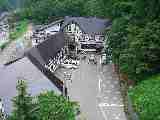 野反湖ロッジの前で記念撮影して7:10に出発。すこし霧雨模様で気にかかる |
