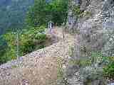 | 川底から数百m、切り立ったガケを切り開いてよくもトロッコ道をつけたもの、と感心する |