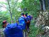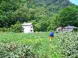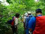 「峠から少し下ったここが平らで、ここに夫人らは泊まった、と父から聞いています」と六合村のNさん |