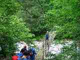 最後に急な下り200mで吊橋を渡ると林道に出る |
