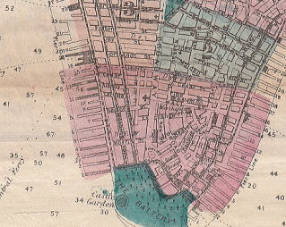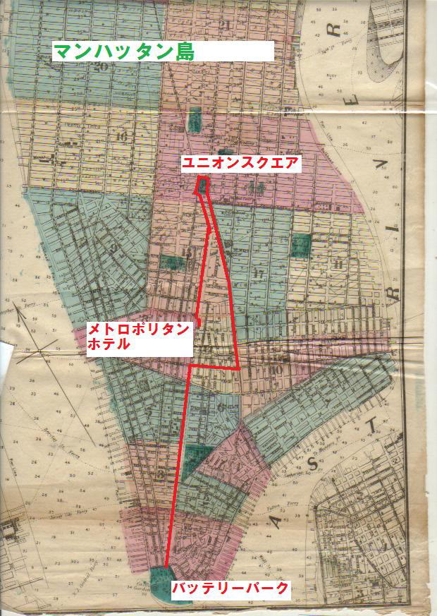| 6月16日(土)朝、一行はフィラデルフィアから汽車でサウス・アンボイまで来て、迎えの河船「アライダ号」に乗り換え、ニューヨーク・マンハッタン島の南端の波止場・バッテリーパークに上陸しました。そこから馬車の行列でブロウドウエーを北上→→グランド通りで右折し→→ボウェリー通りを北に進んで→→4番アヴェニューになり→ユニオンスクエア(公園)西側通りでさまざまな兵士の分列行進を観閲し、再びブロウドウェーを南に下がって、→→メトロポリタンホテルに到着しました。前述のように、この近在から駆け付けた人々も含め一説に50万人という空前の人々が集まって、遣米使節を歓迎しました。 The Japanese delegation traveled by train from Philadelphia to South Amboy, New Jersey. Then, they got on board the steamboat Aliada and proceeded to New York. They landed at the No. 1 pier near today's Battery Park at the southern tip of Manhattan, where they got on horse-drawn carriages to parade the streets of New York. They started the parade at the Battery, marched on Whitehall St. to the north, Broadway to the north, Grand St. to the east, Bowery St. to the north, Fourth Ave. to the north, around Union-square, and Broadway to the south, and arrived at the Metropolitan Hotel. As stated earlier, they were welcomed by about half million people including many from nearby communities. ◇バッテリーパーク(一番下の緑色地帯)の左右両岸に突き出て並ぶたくさんの波止場の数が、国際商業都市の繁栄を象徴している。 ◇ Battery Park is the green area at the bottom in the map blelow. As you can see, there are a lot of wharves poking out on both east and west sides of the south end of Manhattan Iskland. The large number of the wharves symbolizes the prosperity of the interenationally commercial metropolis. |