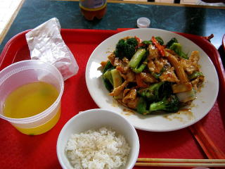 | ▲チキンヌードル 町の中華料理屋で量が多いのを警戒して「ヌードルスープ」だけ頼んでみたら、左のカップに数本のヌードルが泳いでいるシロモノだった。あわてて追加したのが、野菜炒め。 ▲ Chicken Noodle Soup: On a street of South Amboy, we entered a rustic Chinese restaurant. I was afraid that they would serve big dishes, so I ordered only chicken noodle soup. However, the served soup was alomost "instant soup" with a few noodles in a plastic cup. I hurriedly made an additional order for the stir-fried vegetables. |