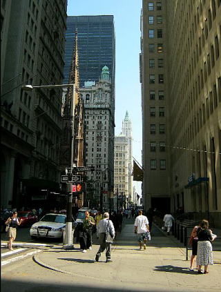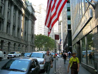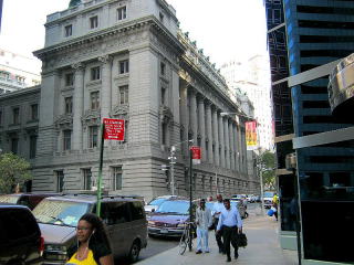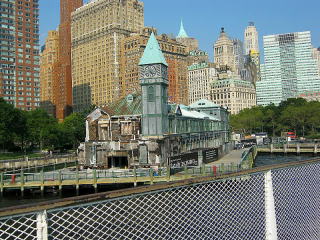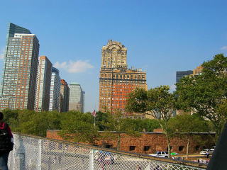 ▲古い建物 バッテリーパーク周辺には古い建物もいくつか目につく。1860年当時の古地図を見ると、マンハッタン島南端部には波止場が数十本もクシの歯のように並び、そこに各国の商船がマストを乱立させて停泊し、ニューヨークは一大商業都市として繁栄していた。 ▲ Old buildings: There are some old buildings near Battery Park among modern buildings. In the map around 1860, there were dozens of piers at the souothern tip of Manhattan island where many commercial vessels berthed like teeth of a comb bristling their masts. New York was prosperous as a commercial metropolis at the time. |