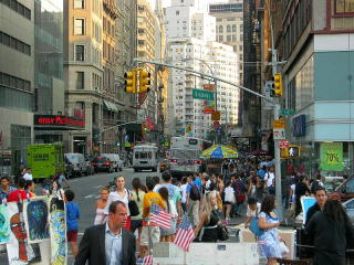 ▲ブロードウェイ 古い石造りの建物がたくさん並ぶ。遣米使節が行進したとき、この両側の歩道もビルの窓もいっぱいの人々が一行を歓迎し、並木に登っている人までいた。 ▲ Broadway: Many old stone buildings are still standing. When the Japanese delegation paraded, the pavements and the windows of buildings were jammed with huge crowds on both sides who were welcoming the Japanese. There were people even on trees around. |
