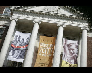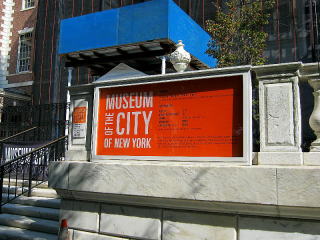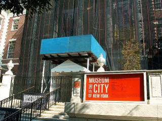| ▲ ニューヨーク市立博物館は、セントラルパークの東側にあります。ちょうど外装工事中(左写真)で、本来は大きな垂れ幕で宣伝している(真ん中写真)ということです。 ▲ Museum of the city of New York is located on the east of Central Park. Unfortunately, renovation work was going on and the building could not be seen well when we visited (photo on the left). Once the work is done, big banners will be hung to advertise the exhibit (photo in the center). |