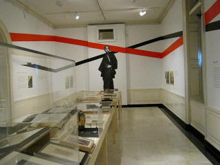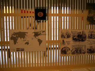 | ▲トミー 当時のアメリカで人気絶頂となった通訳見習いの少年、立石斧次郎の大きな画像が目立ちます。 ▲ Tommy: The figure of Onojiro Tateishi, an apprentice interpreter of 16 years old at the time, is eye-catching in the exhibit. He was the center of the attraction among American people, especailly among ladies, during the journey because of his fearless and cheerful character. |