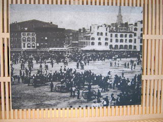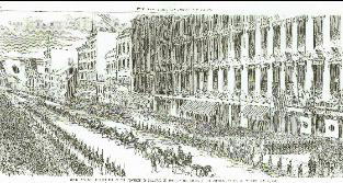 | 行進のコースは 使節は行進の途中、ユニオンスクエア西側の通り(ユニオンスクエア西通り)に設けられた桟敷台に座り、目の前を次々と分列行進する各種軍隊のきらびやかなパレードを観閲した。 During the parade, the Japanese delegation was stationed on a platform on the west side of Union Square and reveiwed the spectacular parades of various units of soldiers who paid the honors of a marching salute to them. |