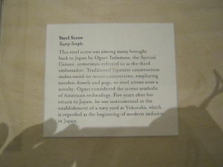 | 里帰りしたネジ釘▲ 解説に「小栗上野介はネジ釘をお土産として、日本をこのようなものをどんどん造れる国に変えることをめざした… 」とあります。 The scree visiting home ▲ The note describes that Kozukenosuke Tadamasa Oguri brought back the screw to Japan and hoped that he would change the country so that it would be able to manufacture things like this in large numbers someday. |