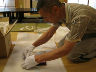 ▲ネジ釘の発送作業 美術輸送専門の業者がやってきて、ていねいに幾重にも梱包して、大金の保険をかけて運んで行きました。 ▲ Packing of the screw: A transportation company specialized in art objects sent us a person, who packed the screw severalfold and took it for the dispatch which was insured for a lot of money. |