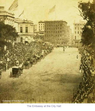| 万延元年(1860)の遣米使節一行は、ワシントン~ボルチモア~フィラデルフィアと汽車で移動し、サウスアンボイから河船「アライダ号」に乗り換えて四月二十八日(1860年6月16日・土曜)、ニューヨーク・マンハッタンの最南端バッテリーパーク埠頭に到着した。「日本人はニューヨークが最後で、帰国する」という報道に、近在の街からもやってきた人も含め50万人の人々が、ブロードウェイを行進する遣米使節一行を歓迎した。 In 1860 (the Year of Man-en 1st), the Japanese delegation traveled from Washington to Baltimore, to Philadephia and then to New York mostly by train. When they traveled from Philadelphia to New York, they got off the train at South Amboy, New Jersey, and got on board the steamboat Alida. The boat arrived with the delagation on board at No. 1 pier near the Battery Park at the southern tip of Mahattan on Saturday, June 16, 1860 (April 28). They paraded on Broadway and other streets and, on the way, they were welcomed by about half million people including many from nearby communities partly because it had been reported that New York would be the last city the Japanese would visit before leaving for their country. |