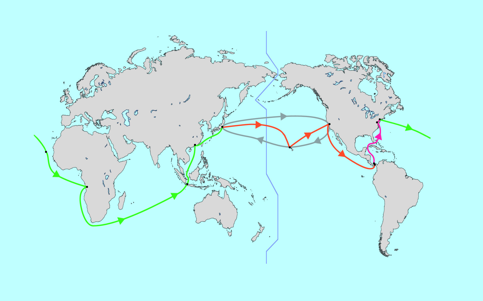 | Chart of their voyage around the globe The vertical blue line is the center is the date line. The red line and the green line are the courses of the delegation. The black line is the route of the Kanrin Maru, which accompanied the mission to San Francisco in a training voyage. ■ The Course of the Mission They traveled around the world on three U.S. warships. Ref. "Three Ships of the U.S. Mission."lack line is the |