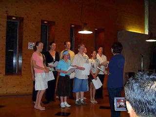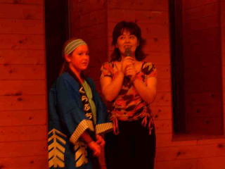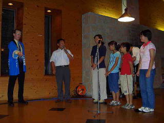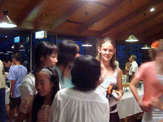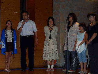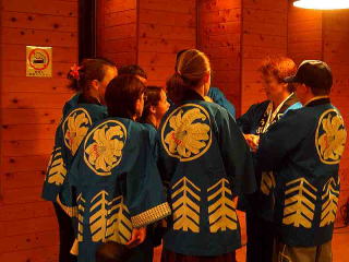 | 19日夜ははまゆう山荘でお別れパーティーです。たのしい歌やダンスを披露してくれました。ハッピは村からのプレゼント。 We had a farewell party at Hamayu Sanso, a mountain cottage, on the evening of Sep. 19th. It was a wonderful time with Australian songs and dances. The Australian friends danced wearing "happi" coats that were gifts for them from the villagers. |