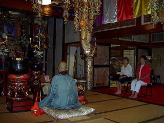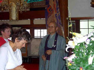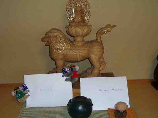 | お別れの朝 本堂で一行の旅の安全を祈って読経し、お焼香をしてもらう。あとに、二人からの御礼のメッセージがそっと残されていました。 On the morning of their departure, the priest recited a sutra praying their safety on the way home. Ms. Eve and Ms. Janina burned incense. After they departed, the priest found a messages of thanks from the teachers in front of a Buddhism statue. "See you again." |