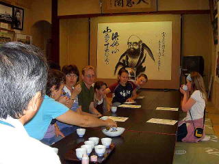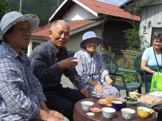 | 門前お茶の会で近所のおばあさんたちとおしゃべりし、わが家で老母と語り、ゆったりした時間が楽しかったようです。 The Australian friends chatted with seniors in the village at a weekly tea party in front of Tozenji. They also talked to Bun, grand-ma at Tozenji: They really enjoyed time with the villagers. |