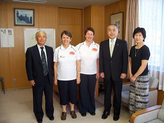 役場の熊も、村長さん(右から二人目)も歓迎してくれました。 They were welcomed by the village mayor (2nd from the right) and the bear statue at the village office. |