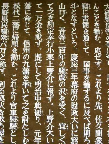 Kozan Takai and Kozukenosuke Oguri Kozukenosuke Oguri was dismissed by Yoshinobu Tokugawa and, just before moving to Gonda Village with the shogunate's permission of his "Application for Returning to Farming," Seiichiro Shibusawa of the Shogitai came to visit him and asked him to become the commander of the Shogitai. However, Oguri refused the request. He may be questioned why he, who advocated the idea of a major war, decided against the request, but he said to Shibusawa that "I would not fight a war without a cause as long as the shogun did not stand up." (Ref. “Political Strife Before and After the Meiji Restoration and the Death of Kozukenosuke Oguri” by Arata Ninagawa) Confucianism teaches that, if the lord does not listen to you even after you have admonished him three times, you should leave him. In layman's terms, you probably felt that you had run out of love for the lord and that it would be futile to fight with him. It is too early to simply assume that Kaishu Katsu was a pacifist who believed in reverence, while Kozukenosuke Oguri, who insisted on fighting, was a warrior. If we assume so, we may be perceived as saying that Oguri deserved to be killed by the Western forces. Kozukenosuke Oguri also said to Eiichi Shibusawa, "If (after the change of government) powerful clans fight each other for merit and become divided into groups, I will send a message to the world in the name of my lord. There are many who have not forgotten the benefits of the Tokugawa family over the past three hundred years.... And if there are no such conflicts, I will live out my life in the countryside as a stubborn citizen of the previous dynasty... I, Taiken Murakami, have long been trying to figure out who Kozukenosuke Oguri imagined as "the one who he never forgets the benefits of" for a long time. However, I found the monument to Kozan Takai in the precincts of Ganshoin Temple that read as follows. "We have received three hundred years of exchange of councils, and we should raise our assets to save ourselves from danger..." At that moment, I realized that these were the words of a man who embodied the image Kozukenosuke Oguri had. This is the very stone monument that tells us that there were men who were in touch with each other and cared about the affairs of the country despite being far away from Edo and the Hokushin area (northern Nagano prefecture). |