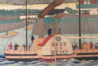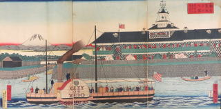 ![]() ▲ 錦絵 築地ホテル 三代目広重画 東善寺蔵 ▲ (Nishiki-e) Tsukiji Hotel, By Hiroshige III (Collection of Tozenji) ![]() ▲錦絵 周重画 東善寺蔵 ▲ (Nishikie) By Chikashige Morikawa (Collection of Tozenji) ![]() ▲錦絵 海から見た築地ホテル 三代目広重画 東善寺蔵 ▲ (Nishiki-e) Tsukiji Hotel seen from the sea, By Hiroshige III (Collection of Tozenji) この絵は、よ~く見ると側車輪のカバーの英語に謎がある If you look closely at this painting, the English on the cover of the side wheel is a mystery. ![]() ▲「CITY OB YEDO」の「OB]は「OF]の誤りであろう。 ■いったい誰が間違えたか、 船尾の旗が星条旗だから船会社のオーナーのアメリカ人が間違えたか、 描く段階でペンキ屋が間違えたか 絵を描いた三代目広重が間違えたか…… ナゾを秘めたまま客を運んでいる… 関連画像 平面図はこちら…国立国会図書館蔵 The "OB" in "CITY OB YEDO" is probably an error for "OF." Who on earth could have made that mistake? The flag on the stern is the Stars and Stripes, so maybe the American who owns the shipping company made a mistake. Or did the painter make a mistake during the painting process? Did Hiroshige III, who painted the picture, make the mistake? ...... The ship was still carrying passengers with the riddle... Related images Click here for the ground plan...National Diet Library |