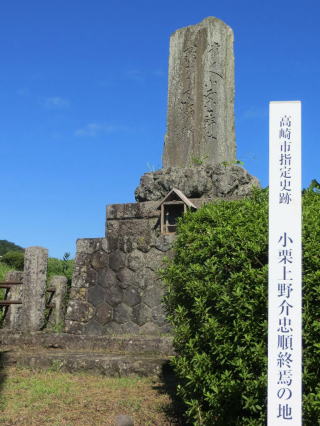 小栗上野介は幕府解散で勘定奉行ほか陸軍奉行などの兼職も一切解かれたので、幕府に帰農隠棲願の許可を得て家族とともに知行地の上州権田村に移り、東善寺に仮住まいをした。ところが、居宅を造り始めて二ヶ月後、やってきた西軍によって養嗣子又一及び家臣六名と共に殺されてしまった。 いま、小栗公らが斬首された烏川の水沼河原(高崎市倉渕町)に、「偉人小栗上野介罪なくして此所に斬らる」と彫られた顕彰慰霊碑が立ち、終焉の地であることを示している。碑文は『維新前後の政争と小栗上野介の死』の著者蜷川新(にながわ あらた)の書である。 Kozukenosuke Oguri was relieved of all concurrent positions of the Tokugawa Shogunate in early 1868, including that of accountant and army magistrate, upon the dissolution of the Shogunate, so he obtained permission from the Shogunate to return to farming and live in seclusion, and moved with his family to Gonda village in Jyoshu (today's Gunma Prefecture), where he was the governor. However, two months after he began to build his residence, he was killed by the Western forces (later the government army), along with his adopted son Mataichi and six of his retainers. Today, a cenotaph stands at Mizunuma Riverbank (Kurabuchi-cho, Takasaki City) on the Karasugawa River where Oguri was beheaded, with the inscription "The Great Kozukenosuke Oguri was beheaded here without sin," indicating that this was the place of his demise. The inscription was written by Arata Ninagawa, author of "Political Struggles Before and After the Meiji Restoration and the Death of Kozukenosuke Oguri." |