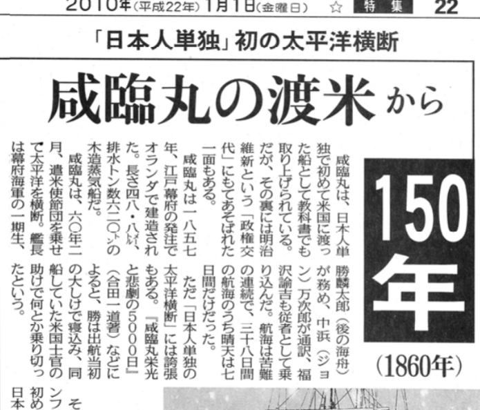 | ◇東京新聞 (2010平成20年1月1日)は…こちらに全文 「咸臨丸の渡米から150年」というタイトルで、「咸臨丸は…遣米使節団を乗せて太平洋を横断」と報道した。「日本人単独」というサブタイトルも間違い。 The Tokyo Shimbun (January 1, 2010 or Heisei 20)...full text here. Under the title "150 years after Kanrin Maru's arrival in the U.S.," the article reported that "Kanrin-Maru...crossed the Pacific Ocean carrying a delegation of Japanese envoys to the U.S." This is incorrect since the Japanese delegation to the U.S. was all aboard the USS Powhatan. The subtitle "Japanese alone" is also wrong. ![]() |