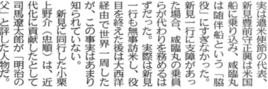 | おかしいのは、この記事の途中に下記のような文章もあって「代表新見豊前守正興だけは米国船で渡米」したように読める。さらに目付「小栗上野介も新見に同行」と紹介されているから、それでは遣米使節団の誰が咸臨丸に乗っていったのか? とわけが解らなくなる。 なんでも咸臨丸、と思いこんでいるからこういうおかしな記事ができる。 *記事後半には電話取材があった住職村上泰賢の談話も入っていて、この記事の内容補強に使われてしまっていた! 取材されたことを反省 m(_。_;m What is strange is that in the middle of this article, there is a sentence that reads as follows: "Only the representative, Buzennokami Masaoki Shinmi, traveled to the United States on an American ship." It is also mentioned that "Kozukenosuke Oguri also accompanied Shinmi." They make it difficult to understand who in the envoys to the U.S. actually boarded the Kanrin Maru. This kind of strange article is created by assuming that everything is about the Kanrin Maru. * The second half of the article includes an interview with me (Taiken Murakami), the priest of Tozenji Temple, who was interviewed by phone, and it was used to reinforce the content of this article! I regret that I was interviewed...(-_-;). |