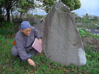 補陀落渡海の碑-2 玉名市伊倉の山上にも下野の僧たちの補陀落渡海の石碑があって、平田さんの案内で見ることができた