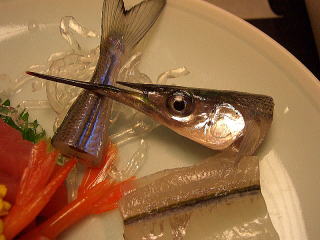 I was treated to a delicious lunch of fish dishes at a restaurant in Kumamoto City. I was told that this was sashimi of Sayori (halfbeak). |