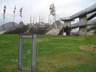 The building is located on the surrounding raised lawn. |