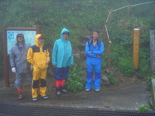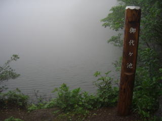 | (Left) Entrance to Miyogaike Pond Joun Kurimoto sent carp from a pond at his house in Tokyo to the island to keep visitors to the island occupied. I wonder how they got carp up here at such a high elevation, even though they were able to transport them by boat and land them on the island by small boat. Ichiro-san, who showed us around, said, "I came here for fishing when I was in junior high school. (Right) There were a short climb and a steep descent. The fog was too deep to take pictures. As I was giving it up, I heard the sound of fish splashing in the fog. There were indeed carp! |
