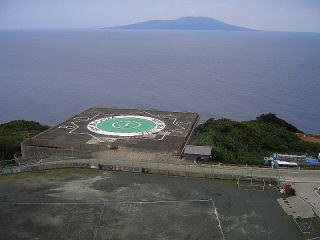 | 東京から南へ200キロ 役場前のテラスのように張り出したヘリポートに着陸した。前方は三宅島 |