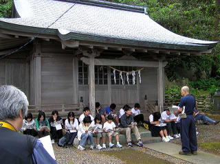 | Lecture on Joun Kurimoto in front of the Soreisha Shrine A plaster statue of Joun Kurimoto is housed in this hall. In the precincts of the Soreisha Shrine, students and teachers from Mikurajima Elementary and Junior High Schools listened to my lecture on "Joun Kurimoto, the Island, and Kozukenosuke Oguri." This was the former Manzoji Temple of the Jodo sect of Buddhism, which was abandoned in the movement of Haibutsu kishaku (of abolishing Buddhism and destroying Shākyamuni) after the Meiji era (1868-1912). It then became a hall called the Soreisha (Ancestral) Shrine, where we found the plaster statue stored when we opened the door inside. |