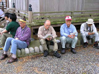 | 祖霊社前で栗本鋤雲の講話 栗本鋤雲(石膏)像がこのお堂の中に納められている 祖霊社の境内で、御蔵島小中学校の生徒と先生が「栗本鋤雲と島と小栗上野介」の話を聴いてくれた。ここはもと浄土宗万蔵寺が明治以後の廃仏棄釈で祖霊社というお堂となって残り、その奥の扉を開けると石膏像がしまわれていた。 |
