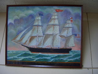 | 左:ヴァイキング号(1400㌧) 1863文久三年六月四日、難破して御蔵島に漂着。アメリカへ運ぶ途中の乗組員23人、雇用の中国人460人を全員無事に島人が救出している。 絵は島の教育長室で撮影 右:イカリ 稲根神社に残されている。大小二つあったという。保存の手立てをしないと、潮風で錆び痩せてゆき、消滅する恐れがある。 |