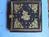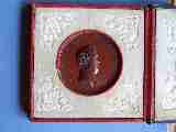 | 記念メダルのケース ケースが箱に入れてきれいに保存され、開けると江幡(荒川)祐蔵の遺品でおなじみの模様が迎えてくれた The case of the commemorative medal from James Buchanan, the 15th President of the U.S. The case was neatly preserved in a box, and when I opened it, I found the familier pattern of the medal which I had seen before on Yuzo Ebata (Arakawa)'s medal. |