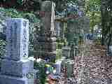 | 町役場の近く、背後の山際に並ぶ三好家の墓地左手にあった The tomb was located on the left side of the Miyoshi family graveyard near the town hall. |