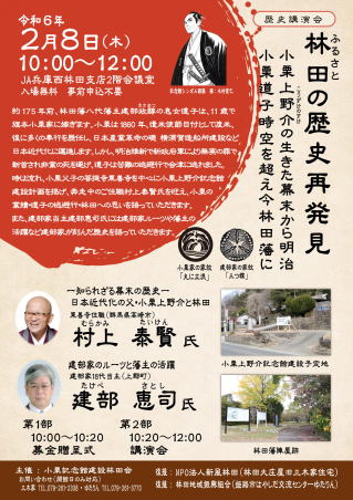| 8日(木) | 10時~ 小栗道子夫人の故地 姫路市林田町で講演します。 ◆建部家18代当主 建部恵司さとし氏 建部家のルーツと藩主の活躍 ◆東善寺 住職 村上泰賢 「ー知られざる幕末の歴史ー 日本近代化の父・ 小栗上野介と林田」 会場:JA兵庫西林田支店 会議室(2F) 姫路市林田町林谷192 時間:10時~12時 入場:無料 事前予約不要 問合せ:三木家079-261-2338 ゆたりん079-261-3770 (開館日のみ対応) |