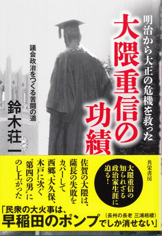| 2月1日(木) | 新刊書 鈴木壮一『大隈重信の功績』(共栄書房・1500円+税) 「…自分は早稲田のOBではないが…」書いたという大隈重信の人物像。茫洋として掴みどころのない大隈の功績を的確に捉えわかりやすく書いています。 「・・・大隈はリリーフで登板するまでは海底に潜んで雌伏している深海魚のようにほとんど目立たず、片隅で閑居研鑽努力を重ね勉学思索にふけっていて、何をしているのか常人にはさっぱりわからない。しかし我が日本がいよいよ袋小路に入って危機に至るや、どこからともなくお声がかかって一気に浮上し、檜舞台に登って快刀乱麻のごとく諸懸案を解決する。そして問題を解決して平穏が訪れると、惜しまれつつ静かに舞台から降りてゆく。だから大隈の功績を理解するには、「我が国が陥った危機の状態がどうだったか」を理解する必要がある。」p.2~ ・明治以後大隈綾子夫人は小栗上野介の従姉妹で、子供の頃の恩義があって、夫妻は明治以後小栗家の遺族を保護した。 |