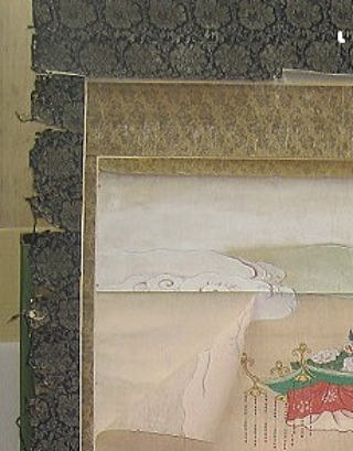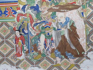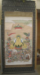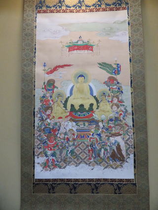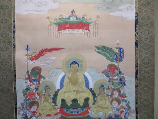 ▲補修前 周囲が切れ、ハガレもある ▼再表装 ![]() 中央にお釈迦様・向かって右が獅子に乗る文殊菩薩・左が象に乗る普賢菩薩 旗の鉾を掲げた東・持国天、北・多聞天、下(見えない)に南・増長天、と西・広目天 が四方を守護している ![]() 右下の笈オイを背負っている人物▲は玄奘三蔵法師 その前の▲赤い服装の小柄な人物は聖徳太子か? |