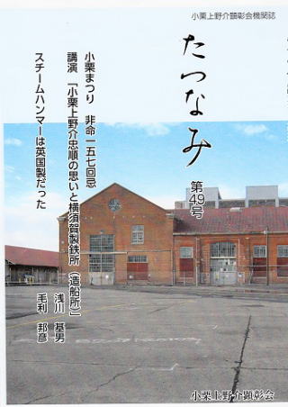 | ◯7日(土) | 小栗上野介顕彰会 機関誌 『たつなみ』49号 発行 主な内容 小栗まつり講演 「小栗上野介の思いと横須賀製鉄所(造船所)」早稲田大学名誉教授浅川基男 秋田で小栗上野介の講演会・遣米使節展 佐藤成孝 小栗上野介記念館建設林田会結成 講演会 村上泰賢 スチームハンマーは英国製だった 毛利邦彦 小栗上野介と渋沢栄一 村上泰賢 「島田弥七郎日記」の小栗上野介処刑・首級運送・権田村探索 中村茂 義烈の家臣池田傅三郎(一) 村上泰賢 中之条ビエンナーレ紅月劇団「Oguri‐小栗上野介‐」 石倉正英 会員募集・顕彰のあゆみ・編集後記 など 【正誤表】 p40 8行目 及び 下の家紋説明 武部 → 建部 |
