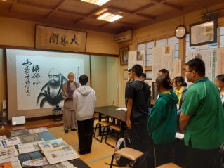 | 2日(木) | 09:30~ タイ国の高校生が研修しました。 「くらぶち英語村」に宿泊しているタイ国の高校生と引率の教師が東善寺を訪れ、研修しました。タイ国も国民の92%が仏教徒といわれる仏教国ですが、「南伝仏教」と言ってインドから~スリランカを経て~ビルマ(ミャンマー)・タイ・ラオスなどに伝わりました。日本に伝わった仏教はネパール・チベット・モンゴル~中国・朝鮮などを経て伝わっているので「北伝仏教」と言い、同じ仏教でもどういう点を重視するかで仏教習慣も異なります。 高校生は日本語を少し理解できるので、そういった基本的な話や、禅を伝えたインド人達磨大師の話を先代住職村上照賢が描いた大広間の大きなダルマ絵で紹介。 本堂に移って、お釈迦さまの教えのシンボル「蓮の花」を、木で彫って金箔を貼った造花「木蓮華」としてほとんどの寺で飾っているその蓮華の花の意味二つを紹介。坐禅をして約2時間の研修となりました。 |