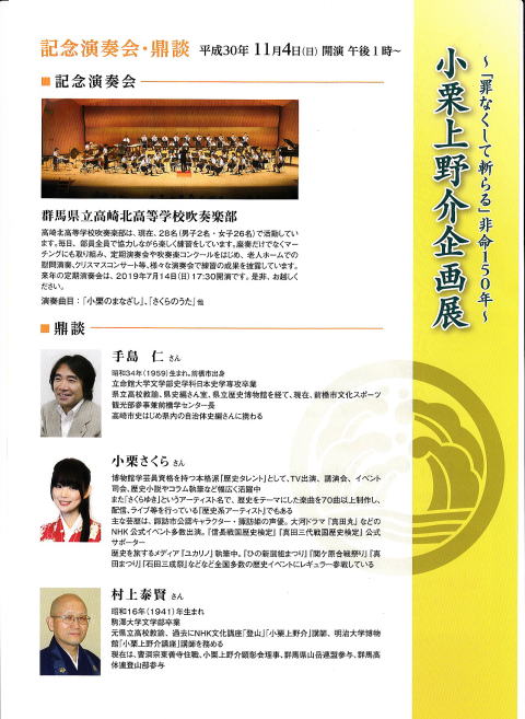 | 鼎談 手島仁 前橋学センター長 県内自治体史編纂に干与 小栗さくら 歴史タレント・歴史をテーマとした楽曲制作 + 江原昌子 上毛新記者 「上州と小栗の幕末維新」を連載中 ◆コーディネーター 村上泰賢 東善寺住職 小栗上野介顕彰会理事 |