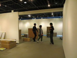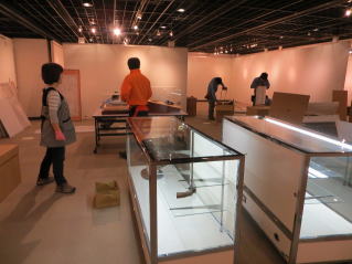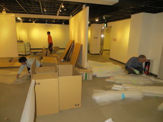 | ▲設計図に合わせて壁を移動して会場の基本づくり。壁の部門別に荷を運びこむ。荷をほどき・ピクチュアレールにフックをつけ、その下にワイヤーを付ける。 | ||||||||||||||||||||||||||||||||||||||||||||||||||