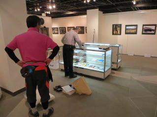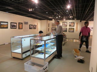 | ▲ワイヤーにパネルを下げ、その下に、説明キャプションを配って、壁に止める。ガラスケースに遺品や展示物資料を入れ、綺麗に並べる。 | ||||||||||||||||||||||||||||||||||||||||||||||||||