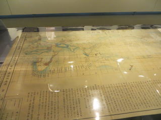 ▲広瀬保庵筆「環海航路地図」 遣米使節に随行した山梨県の医師が文久二年に発刊した世界一周地図。細かな行程記録に驚く。 |