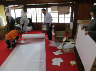 | ▲撤収は早い。外したパネルを箱に入れ、ワイヤーやフックを外し、壁を収納してゆく。24日に寺へ運び込んで荷をほどき、約2時間で作業終了。 | ||||||||||||||||||||||||||||||||||||||||||||||||||