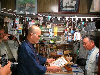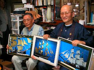 | 遣米使節三船の帆船模型を制作してくださった岡崎さんを宮城県大崎市訪ね、感謝状をさしあげました。制作募金に応じてくれた多くの皆さんにも感謝申し上げます。 2007平成19年7月 We visited Mr. Hideyuki Okazaki in Osaki City, Miyagi Prefecture, to present a letter of appreciation to him for his work on the models of the three sailing ships for the Japanese envoys to the United States. We also thanked the many people who donated to the production of the models. July 2007 |