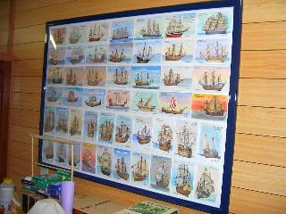 廊下には岡崎さんの絵心を示すたくさんの帆船の絵が掲げられています Many pictures of sailing ships were displayed in the hallway of his house, showing Mr. Okazaki's artistic spirit. |