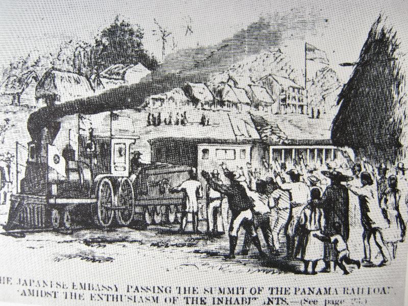 | ■パナマ 遣米使節一行は安政七年=万延元年閏三月四日(1860年4月24日・火)、パナマに着いたがそのまま沖合のポウハタン号船中で一泊。翌日五日(4月25日)、ポウハタン号に別れを告げ川蒸気船に乗り換えてパナマ港に上陸。港まで敷かれた線路と駅舎があり、パナマの街なかを見ることなくすぐにパナマ鉄道に乗車した。珍しい日本人が大勢来たということで、沢山の人々が詰めかけたので、銃を持った軍隊が並んで通行路を確保していた。 ■ サンパブロで休憩・昼食ーアスピンウオールへ 「人家5、6軒 酒食出る 氷塊もあり 炎暑の気候なる故極美なり 此所迄英国其他のコンシュル送来る」 (by通訳・名村五八郎『亜行日記』 ) 途中サンパブロ駅で休憩。鉄道会社の歓迎として盛り沢山な料理が用意されていた。出されたオレンジジュースに氷が入っていて、なんだかわからず、かんで驚きあわてて吐き出した者もいた。炎暑のパナマで飲んだ冷たいジュースの味は後々まで語りぐさになるほどおいしかった。 *いまサン・パブロ駅は後にできたガツン湖の湖底となっている。 パナマからおよそ3時間で大西洋側アスピンウォール(現在のコロン)に到着。すぐに迎船ロアノーク号に乗船した。迎え船を命じられたロアノーク号はなんと、およそ十ヶ月もアスピンウオールに待機(十二ヶ月、廿ケ月など諸説あり)していたという。 *日本では三月十八日に「万延元年」と改元していたが、使節一行は帰国するまで知らなかった *この日付は日付変更線を通過以後の修正した日付。 |